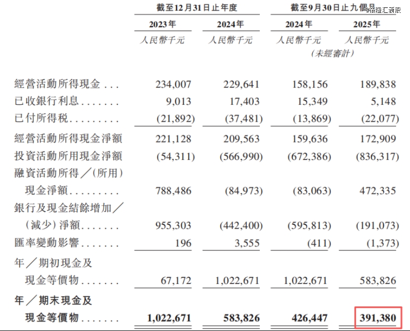 截至2025年9月底,公司持有现金及现金等价物3.91亿元,较2024年年底的5.84亿元有所减少。