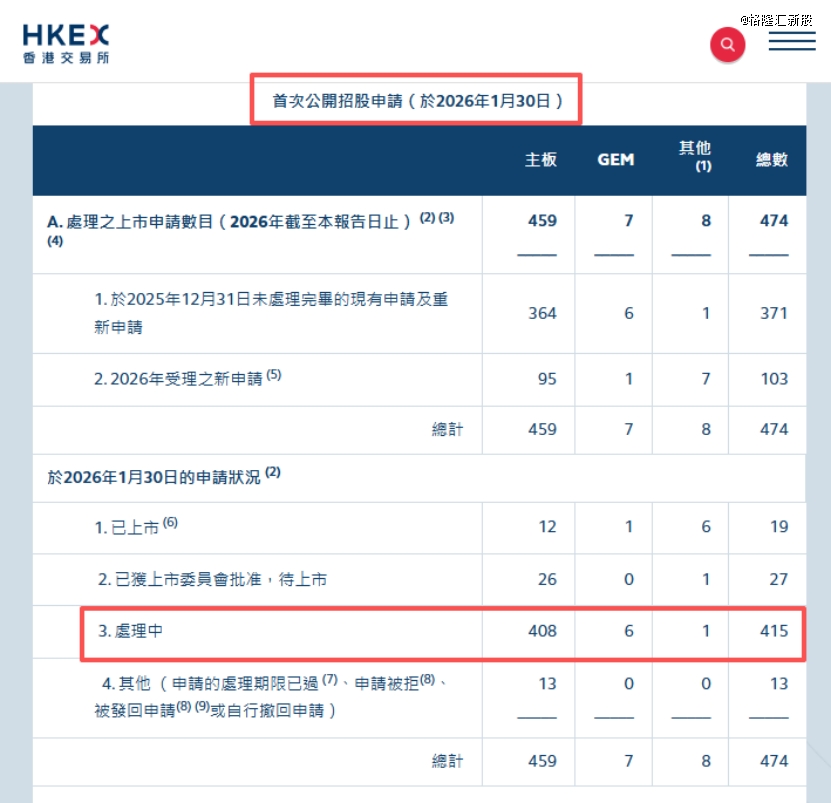 据港交所数据,截至2026年1月30日,正在处理中的IPO公司有415家,其中2026年受理的新申请有103家。