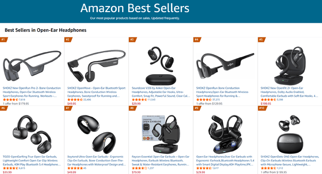 价格方面,10款产品售价在29.98美元到199.95美元之间,共有4款产品超过100美元,均来自Shokz韶音品牌。