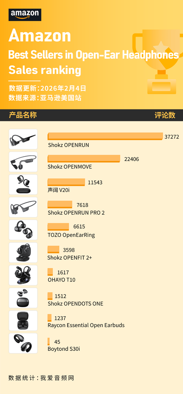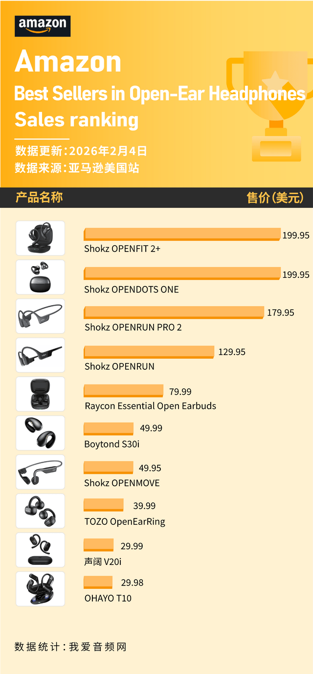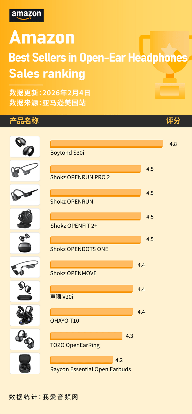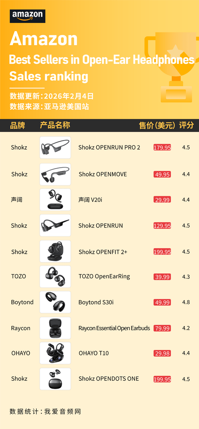我爱音频网将从产品售价、产品口碑、产品互动量三个角度入手,去分析上榜耳机的产品特性与优势,以便更好地了解市场动态。以下数据截止至2026年2月4日,美国亚马逊 Open-Ear Headphones分类销售排行榜前十的开放式耳机。产品价格、评分、互动量均以统计时的数据为准。
